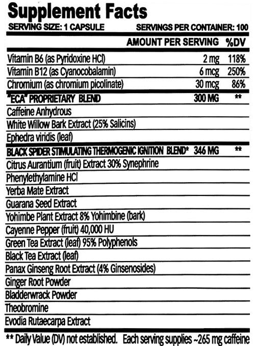 Black Spider é um poderoso queimador de gordura da Cloma Pharma com 25 mg de efedrina. Este suplemento para emagrecimento pode ser comparado ao ECA Stack original. Ele pode proporcionar aos usuários perda de peso rápida e queima de calorias.† Cansado de usar suplementos para emagrecer que prometem grandes resultados, mas não cumprem? Então o Black Spider Fat Burner é para você.